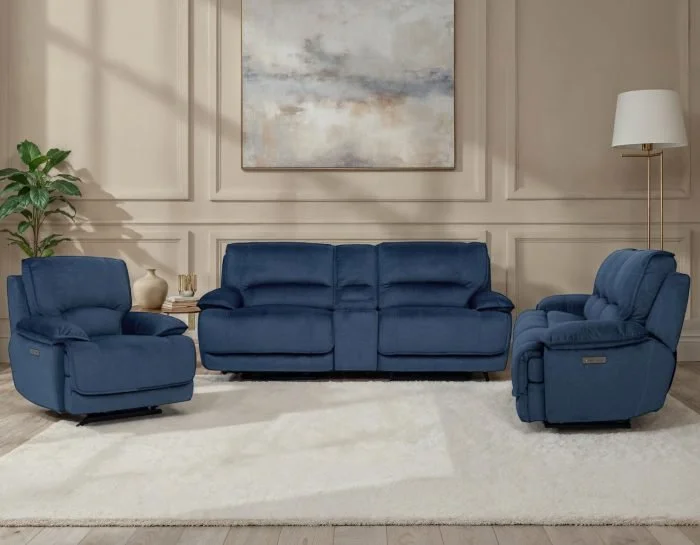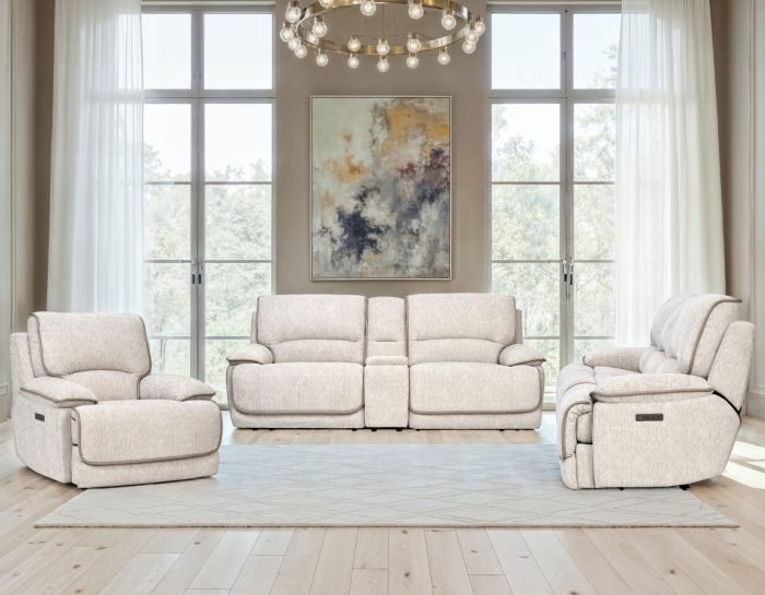 Dual power controls adjust the headrest and footrest for personalized, zero-gravity comfort, all wrapped in soft plush fabric with stylish welt accents.